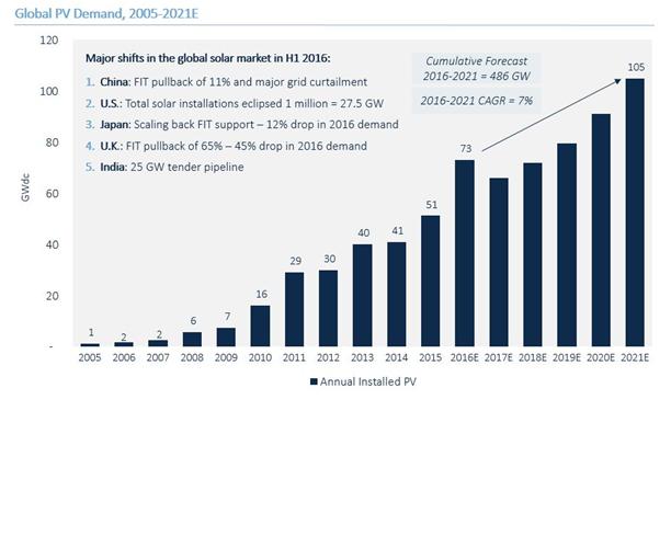 根據(jù)GTM最新發(fā)布的太陽能需求監(jiān)測報告來看,2016年,全球新增太陽能裝機容量將比去年增長43%,達到73吉瓦。